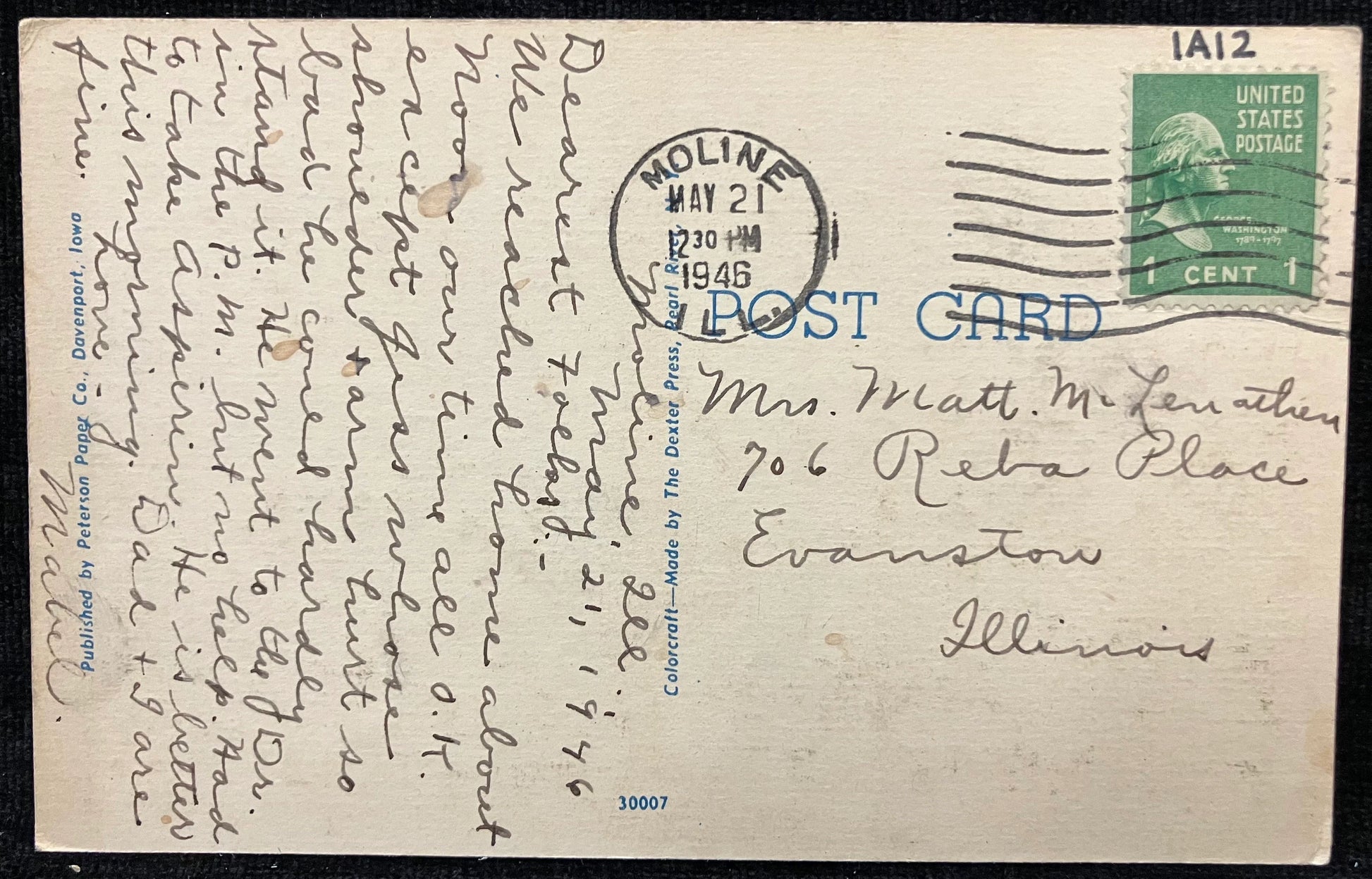 Mailed: Postmark in 1946 from Moline, Ill., with a green one-cent George Washington stamp