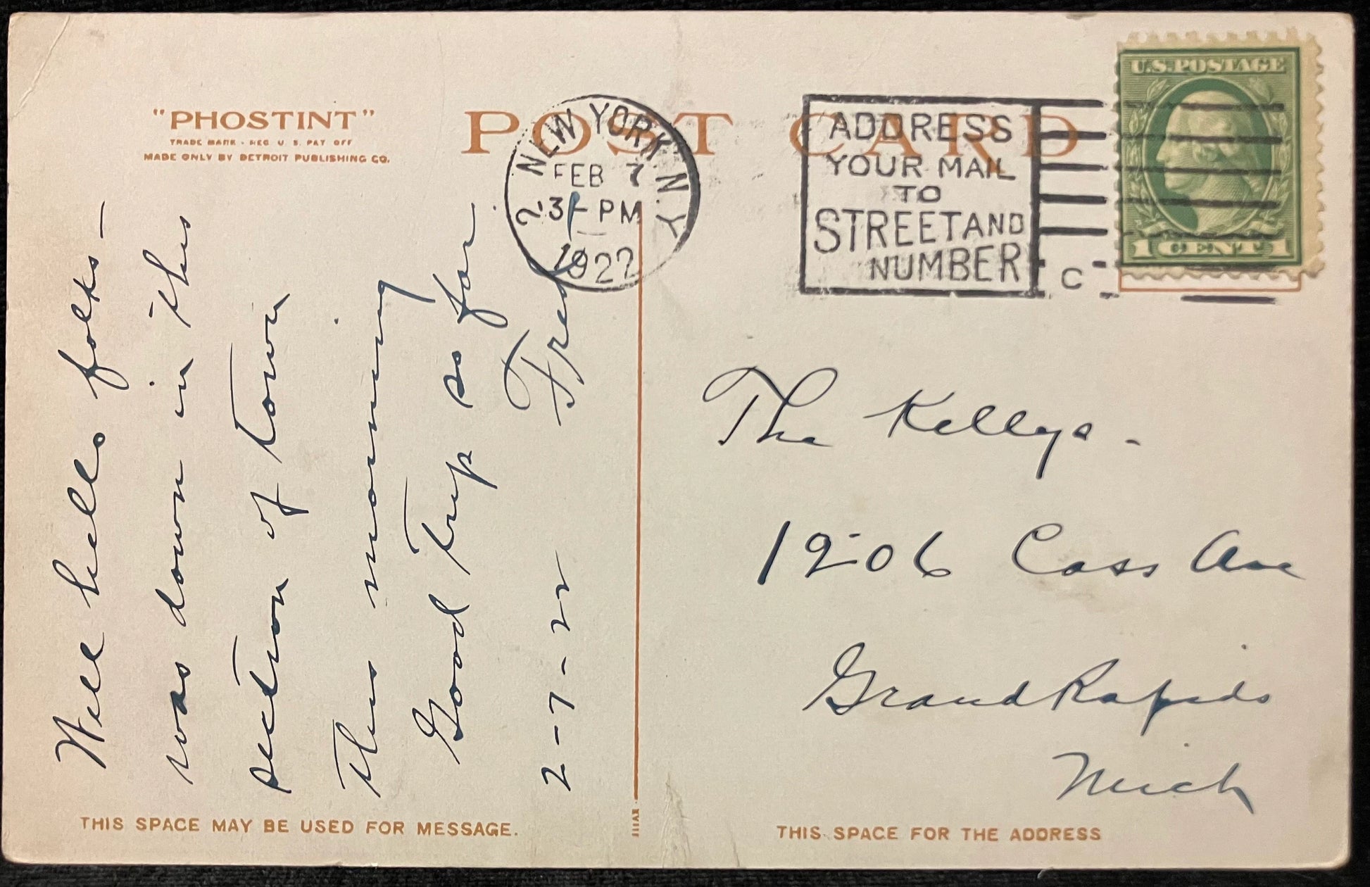Mailed: Postmark on February 7, 1922 from New York, N.Y.