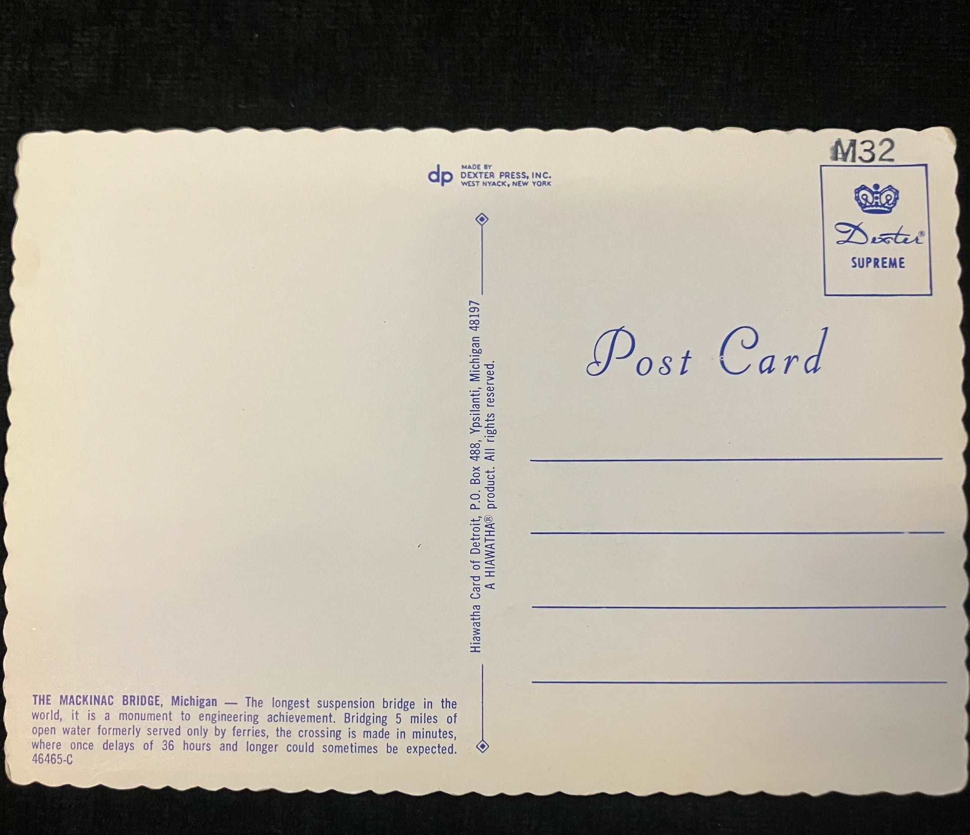 On back: The Mackinac Bridge, Michigan - the longest bridge in the world, it is a monument of the engineering achievement. Bridging 5 miles, an open water, formally served only by ferries, the crossing is made in minutes, where once delays of 36 hours and longer could sometimes be expected.