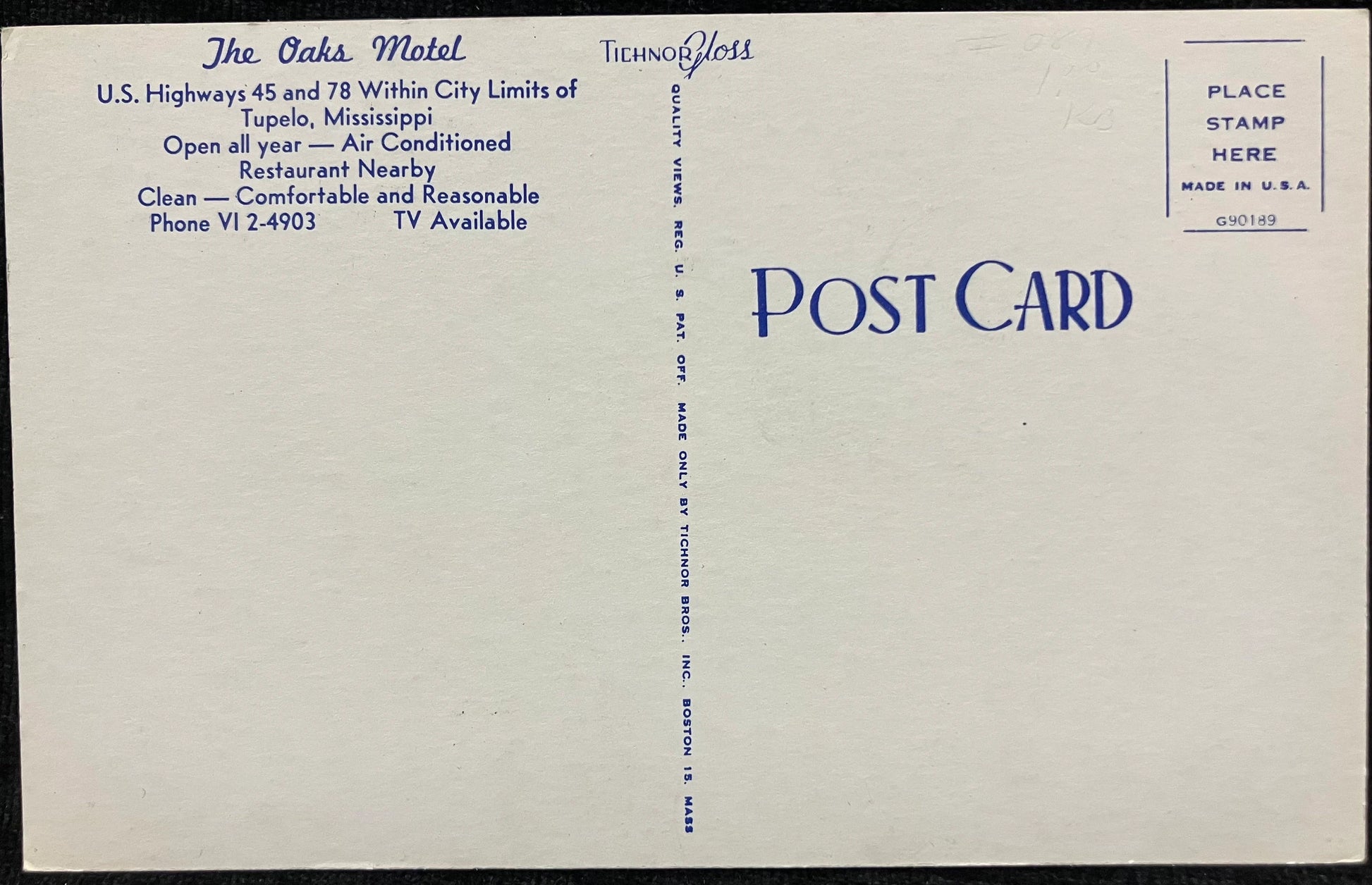 Back: The Oaks Motel U.S. Highways 45 and 78 Within City Limits of Tupelo, Mississippi Open all year - Air Conditioned Restaurant Nearby Clean - Comfortable and Reasonable Phone VI 2-4903 TV Available