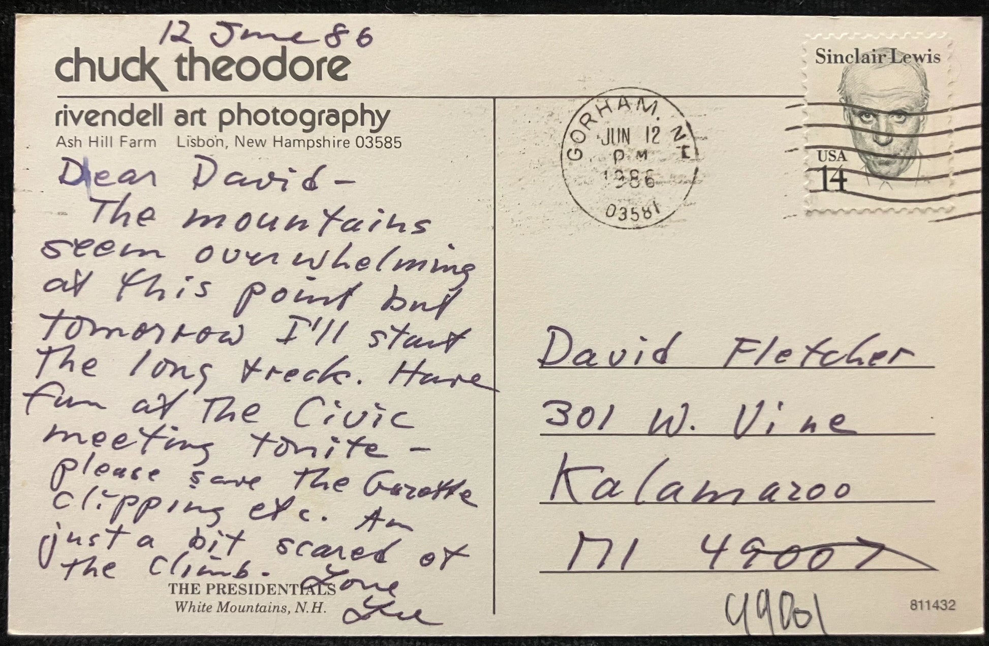 Mailed: Postmark on June 12, 1986 from Gotham, N. H. with a fourteen cent Sinclair Lewis stamp
