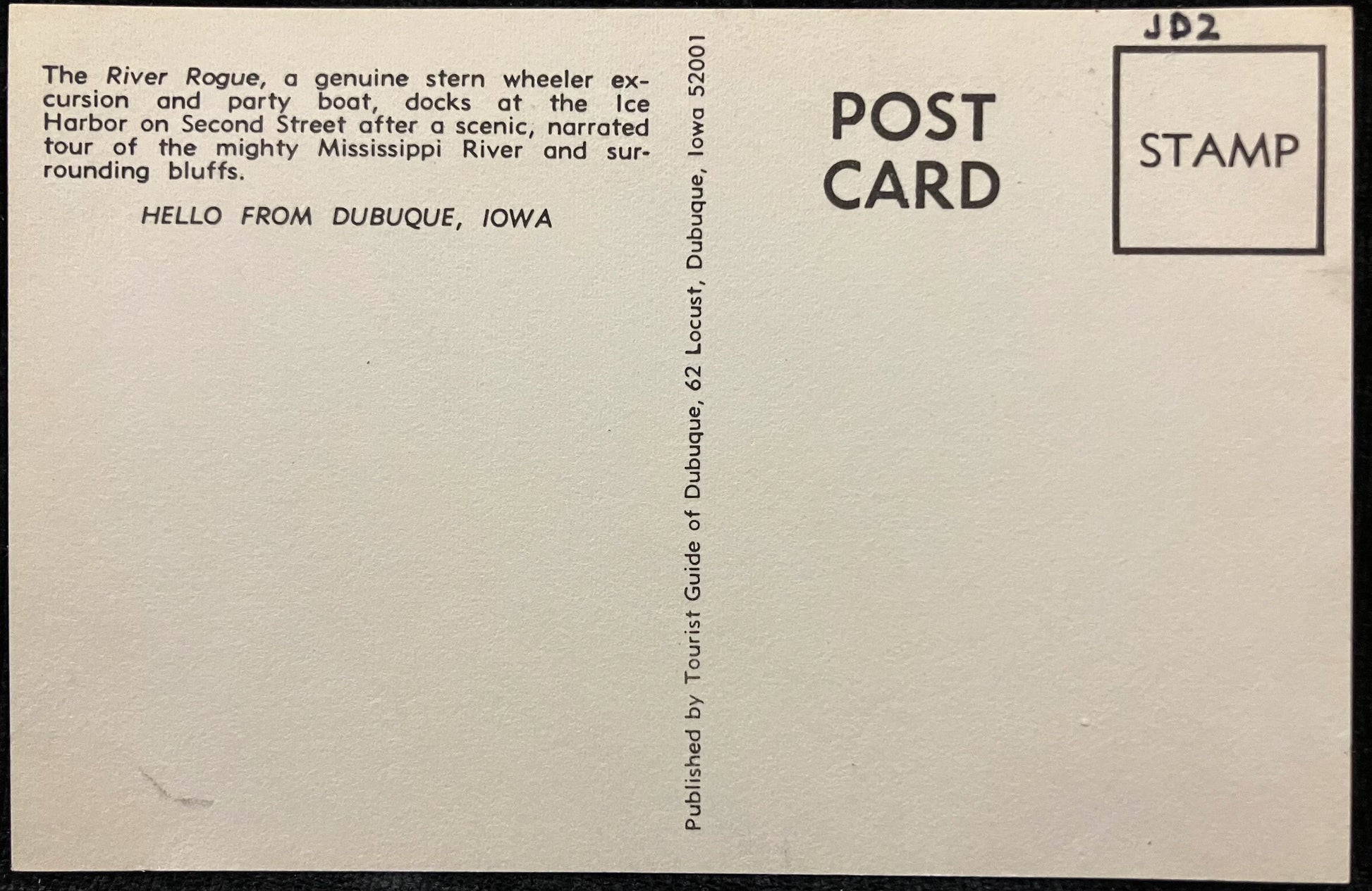 On front: A photo of The River Rogue on the Mississippi River in Dubuque, Iowa