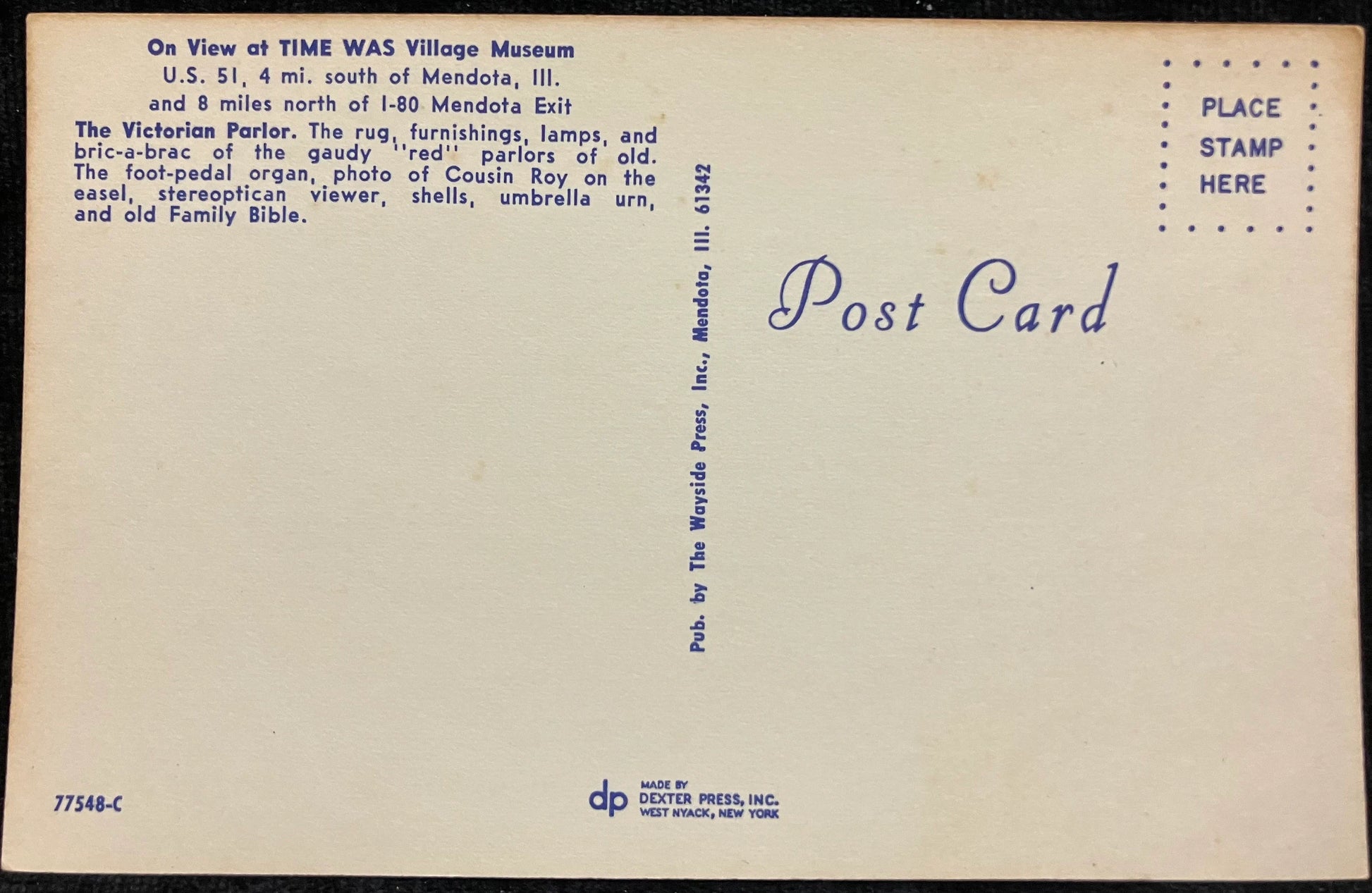On front: A photo of The Victorian Parlor at the Time Was Village Musuem in Mendota, Ill.