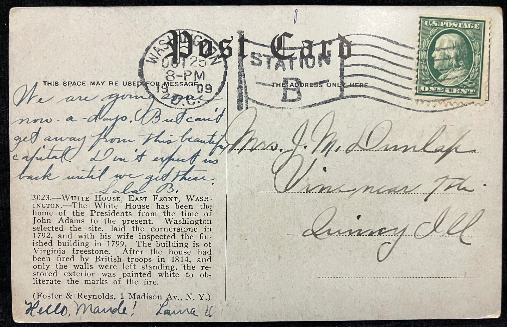 Mailed: Postmark in 1909, green one cent Benjamin Franklin stamp