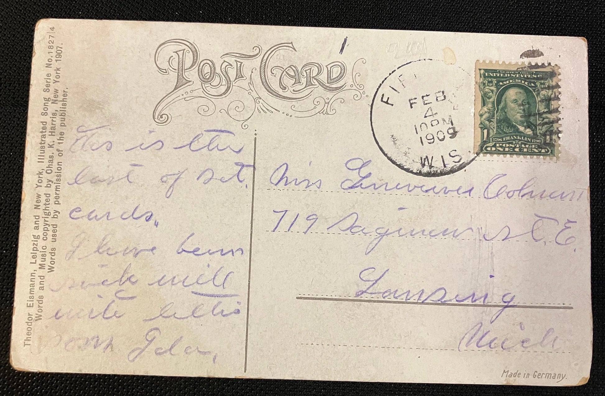 Back of card: Theodore Eismann, Leipzig and New York. Illustrated Song Serie No. 18274. Words and music copyrighted by Chas K Harris, New York 1907. Made in Germany. Hand tinted, real photograph used to create the offset printed card.