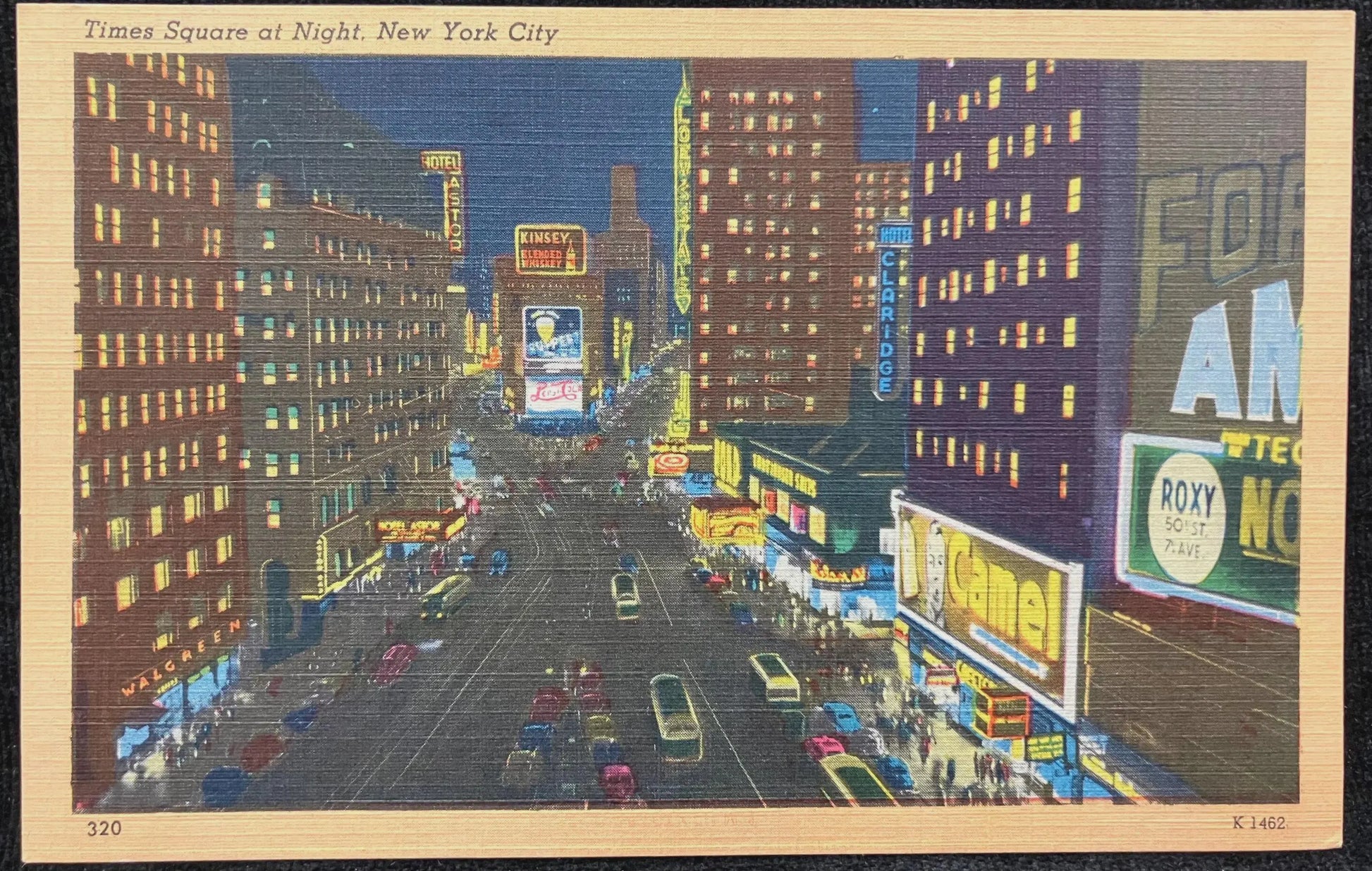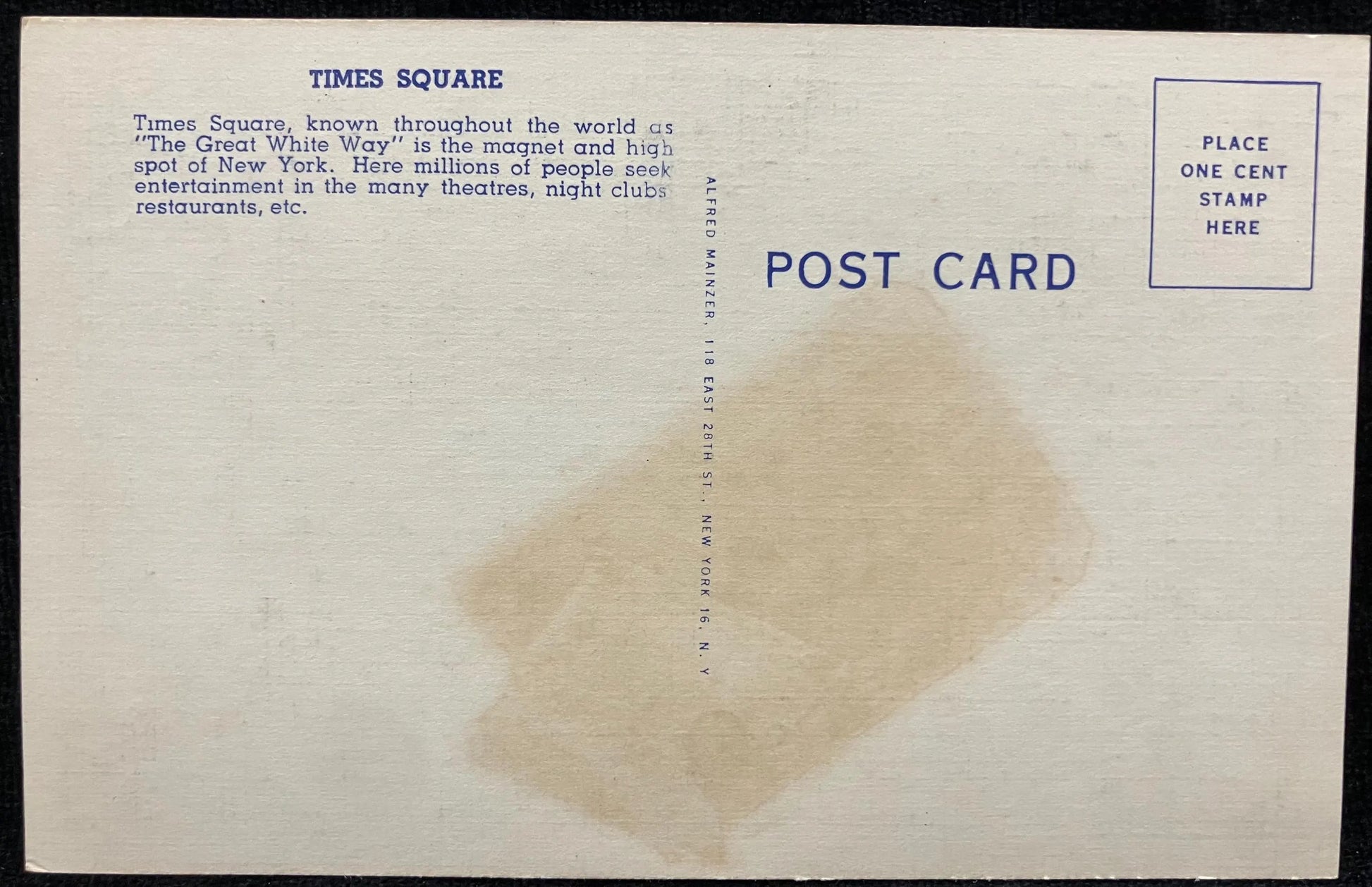Back: TIMES SQUARE Times Square, known throughout the world as “The Great White Way” is the magnet and high spot of New York. Here millions of people seek entertainment in the many theatres, night clubs restaurants, etc.