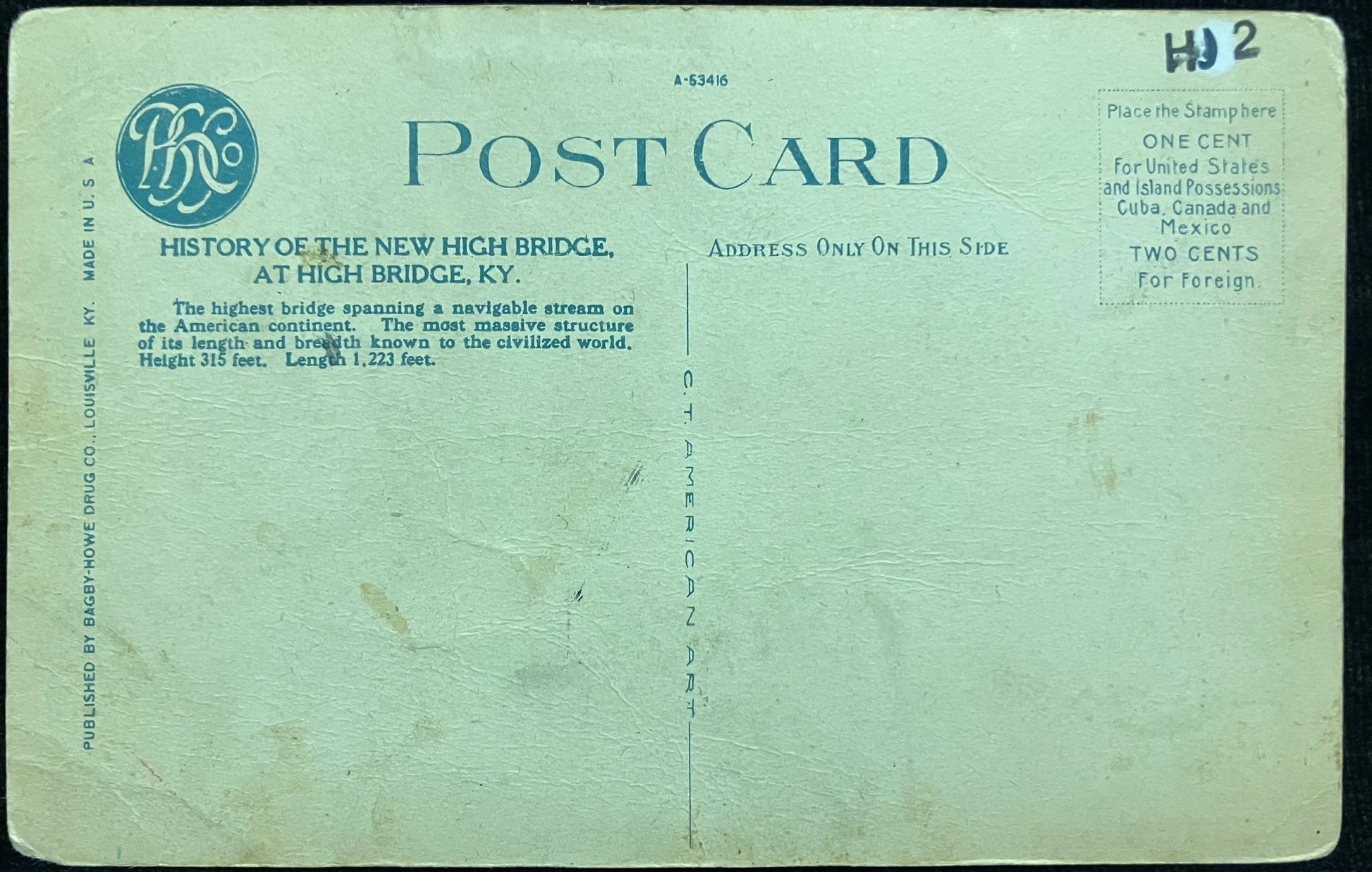 On back: HISTORY OF THE NEW HIGH BRIDGE, AT HIGH BRIDGE, KY. The highest bridge spanning a navigable stream on the American continent. The most massive structure of its length and breadth known to the civilized world. Height 315 feet. Length 1,233 feet.