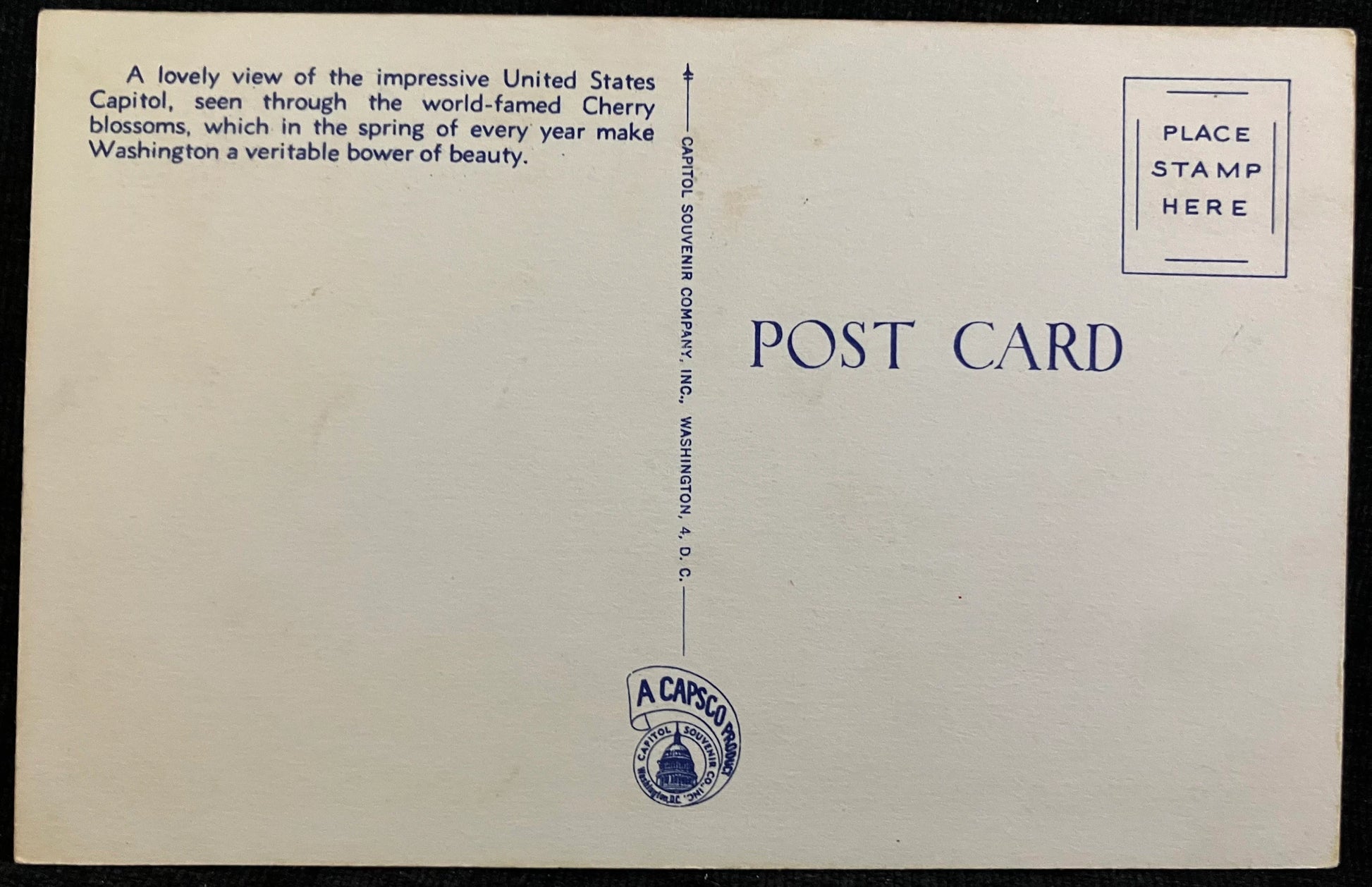 Back: A lovely view of the impressive United States Capitol, sent through the world-famed Cherry blossoms, which in the spring of every year make Washington a veritable bower of beauty.