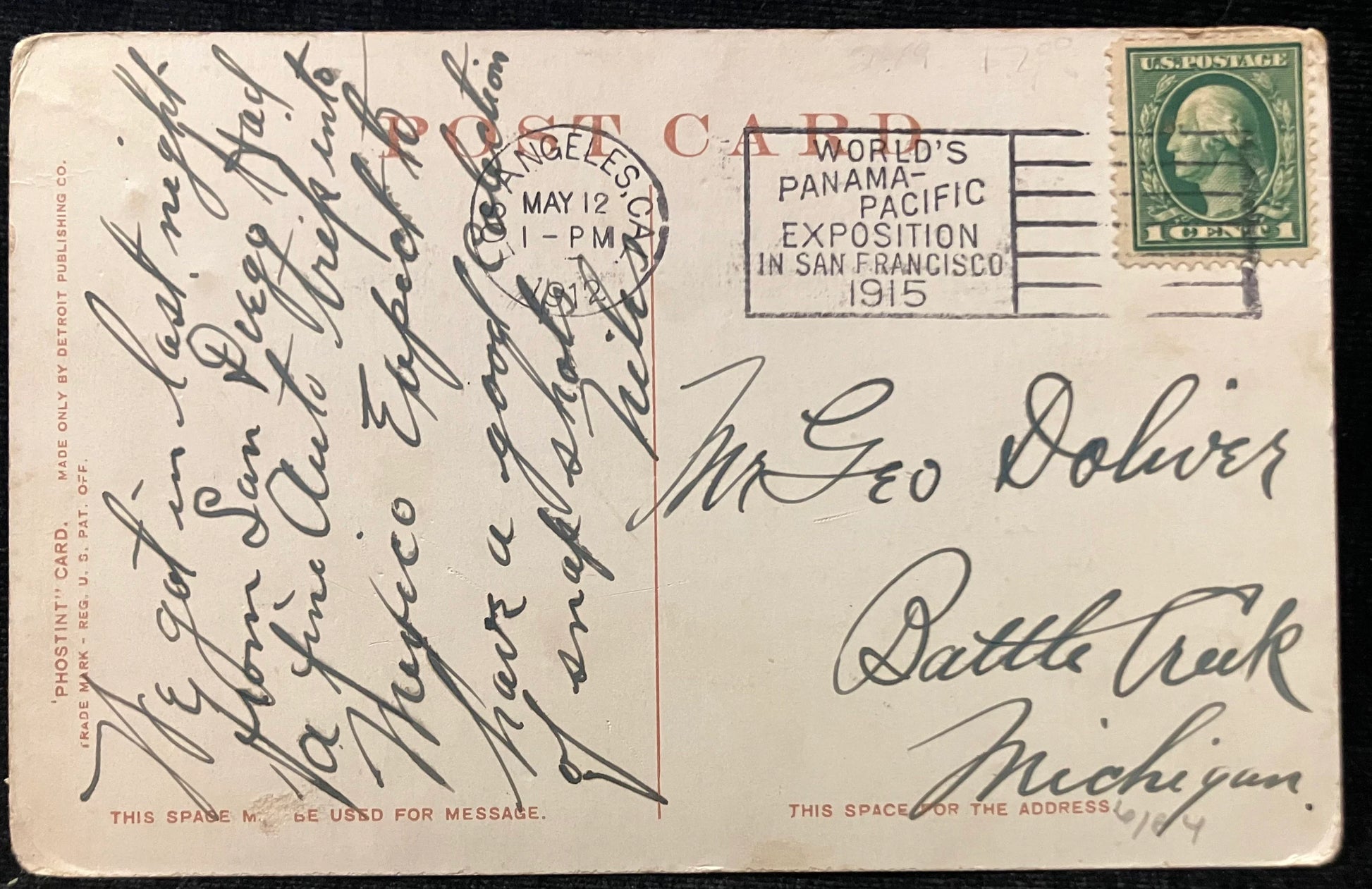 Mailed: Postmark: 1912 green one cent George Washington stamp and World’s Panama Pacific Exposition in San Francisco 1915 ink postal stamp