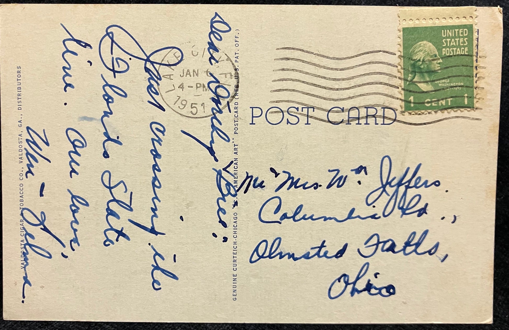 Mailed: Postmark in 1951 from Lafayette, FLA with a green one cent George Washington stamp