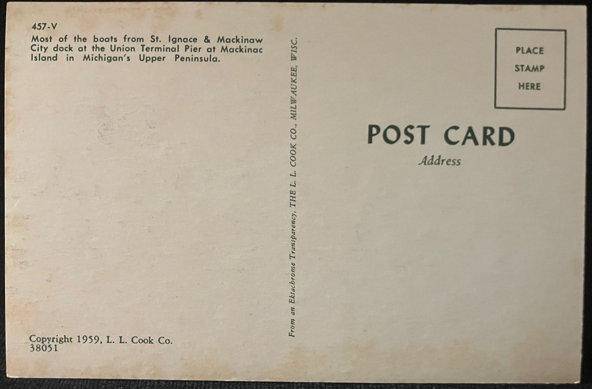 On back: Most of the boats from St. Ignace & Mackinaw City dock at the Union Terminal Pier at Mackinac Island in Michigan’s Upper Peninsula.