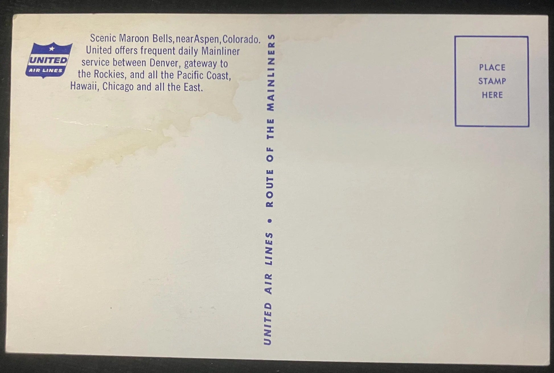 On back of card:  Scenic Maroon Bells, Near Aspen, Colorado. United OFfers frequent daily Mainliner service between Denver, gateway to the Rockies, and all the Pacific Coast, Hawaii, Chicago and all the East.