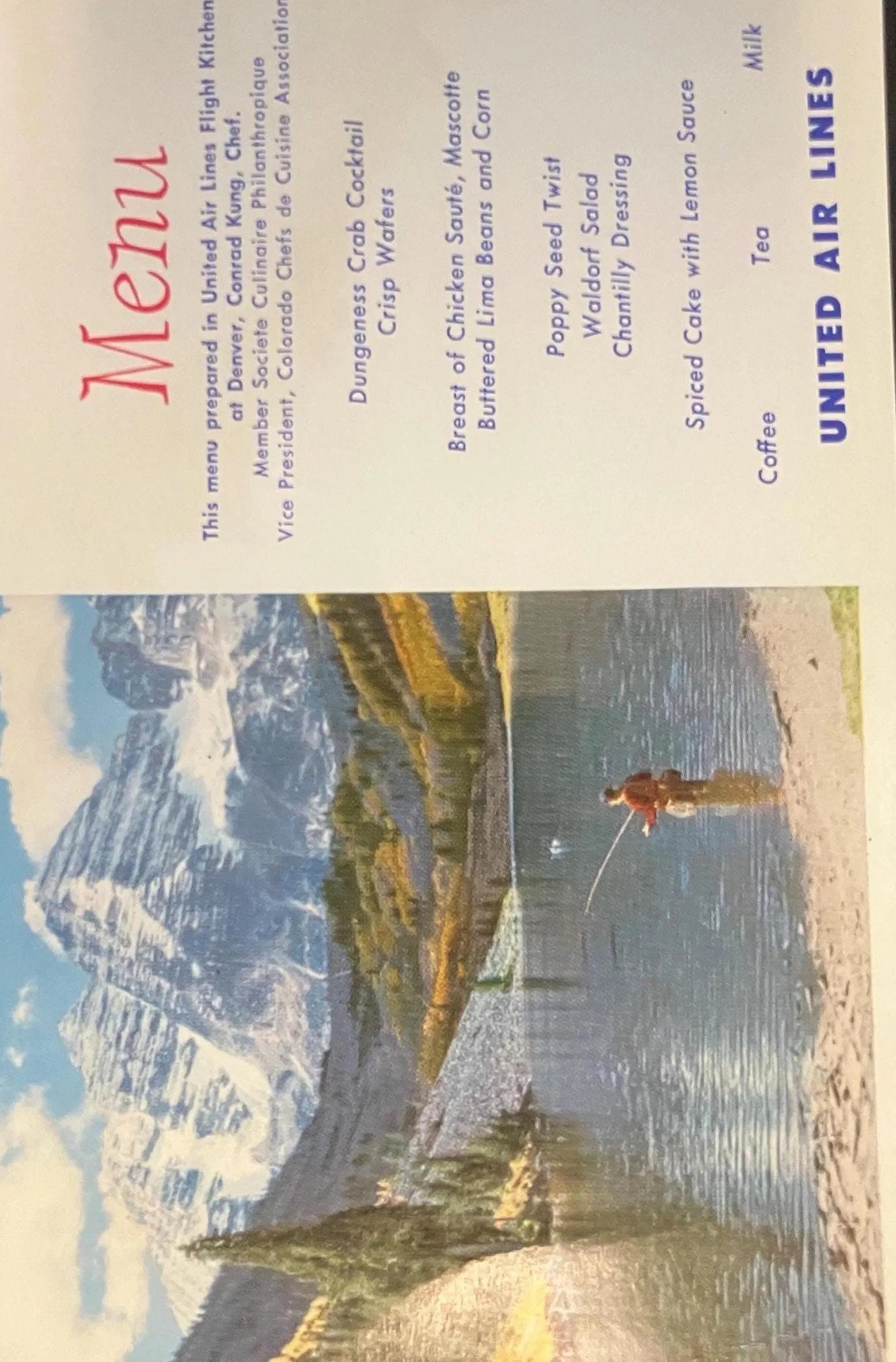 On front of card: Menu of United Air Lines including drinks, entrees, and sides next to a picture of a man fishing in Maroon Bells, Colorado.