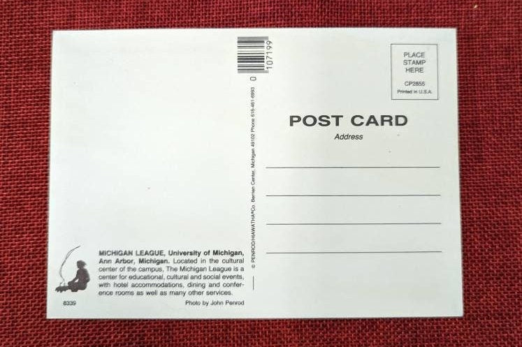 This postcard is a glimpse into the past of the University of Michigan's Central Campus, highlighting the League and Bell Tower. It was printed in the 1970s by Hiawatha Card in Detroit. The photo is credited to John Penrod. A perfect gift to an alumn of the University or someone who has fond memories of the school.