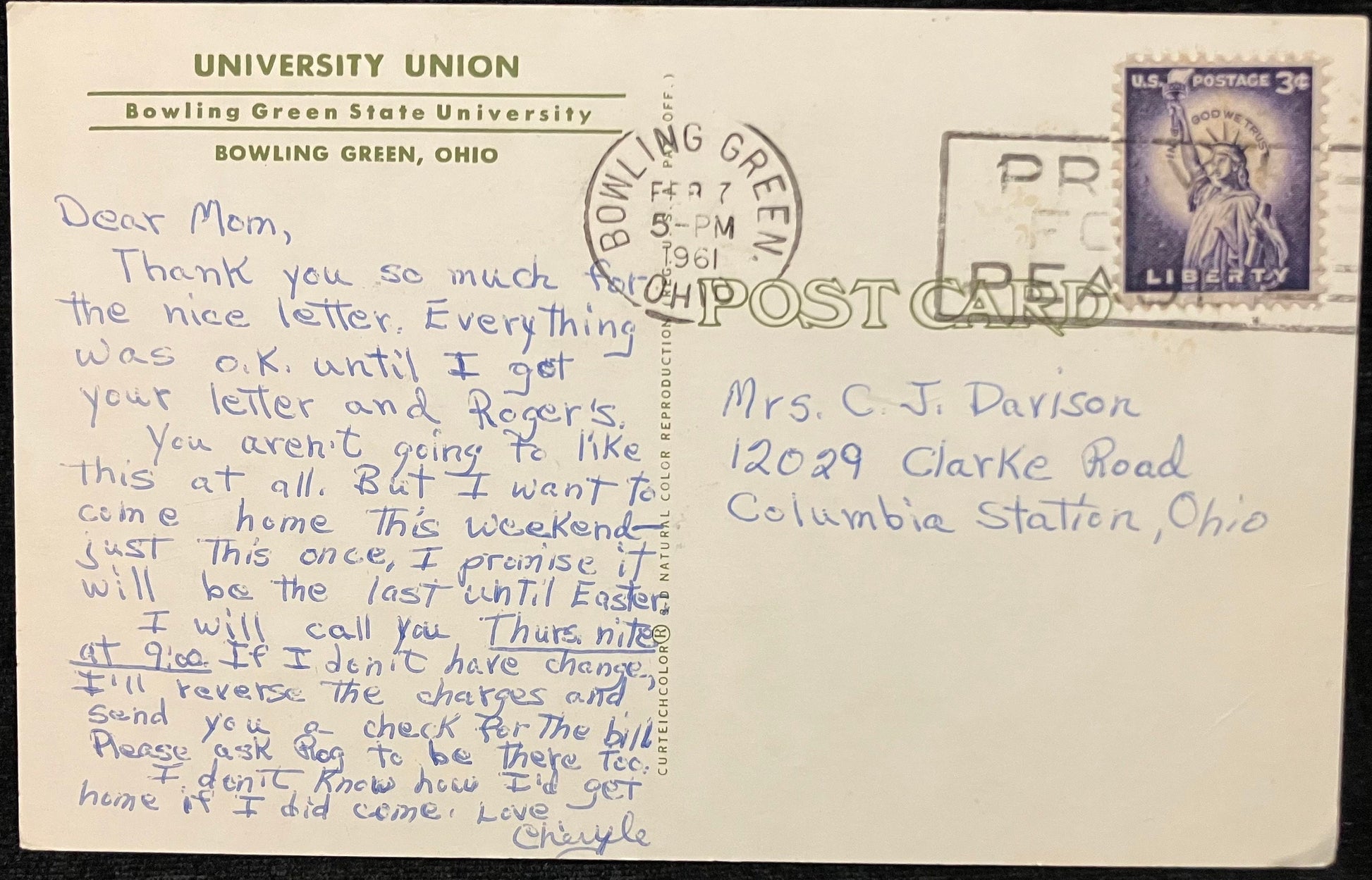 Mailed: Postmark on February 7, 1961 from Bowling Green, Ohio with a purple three cent purple Liberty Stamp