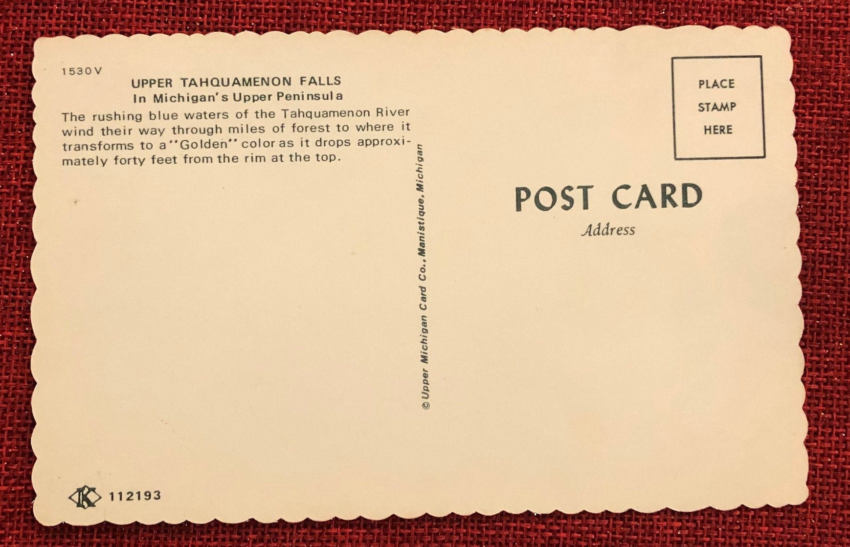 This postcard shows a scenery of Tahquamenon Falls in Upper Peninsula, Michigan. The golden color of the water shows beautifully as it drops the forty feet from the rim. It was produced in the 50s in Manistique, Michigan.