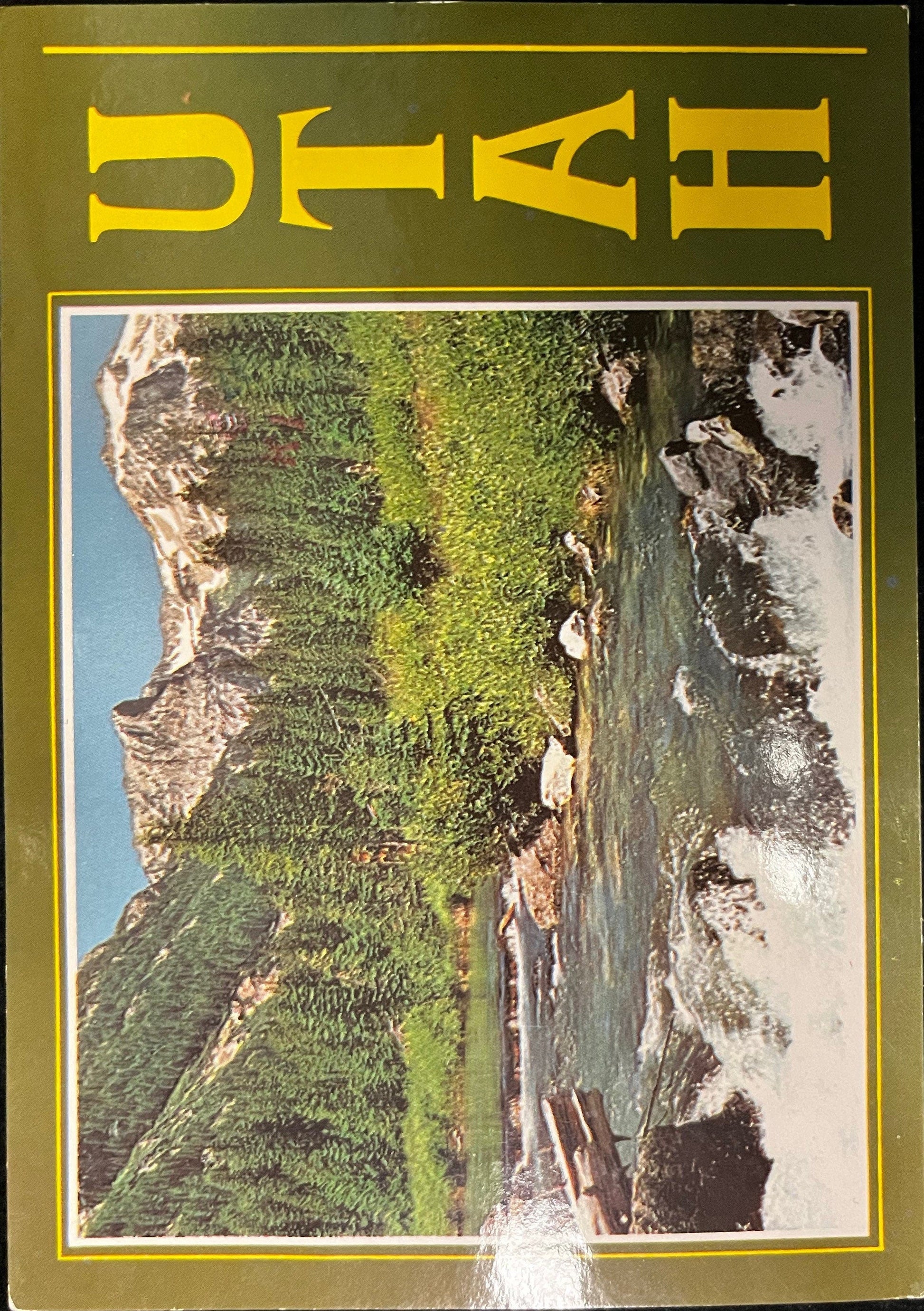 This postcard features the image of the river with lush greenery on the side and mountains in the background. In excellent condition, there is some wear on the corners and the written message on the back seems to have washed away.