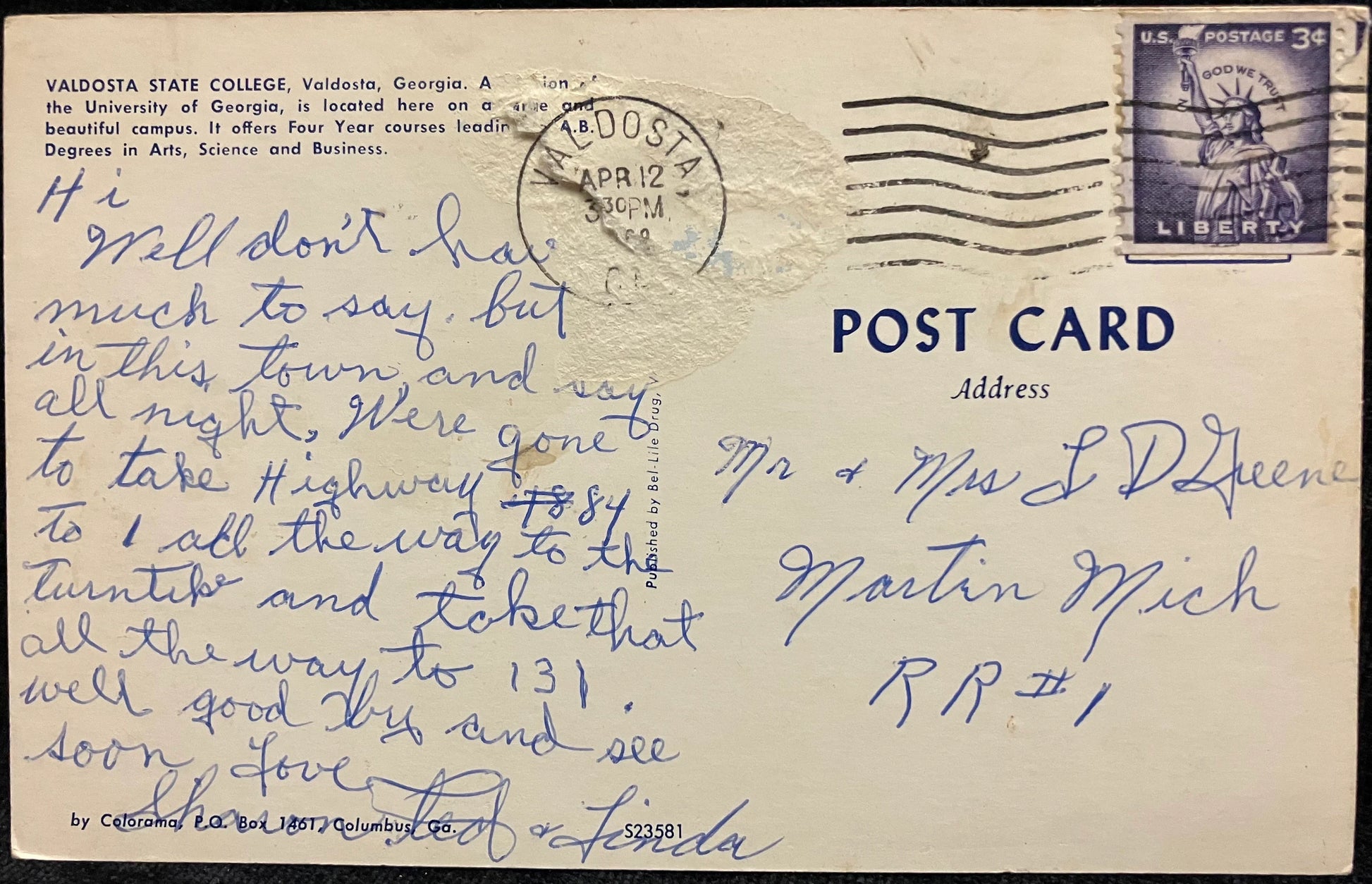 Mailed: Postmark Apr 12, 1968 from Valdosta, GA with a purple three cent Lady Liberty Stamp