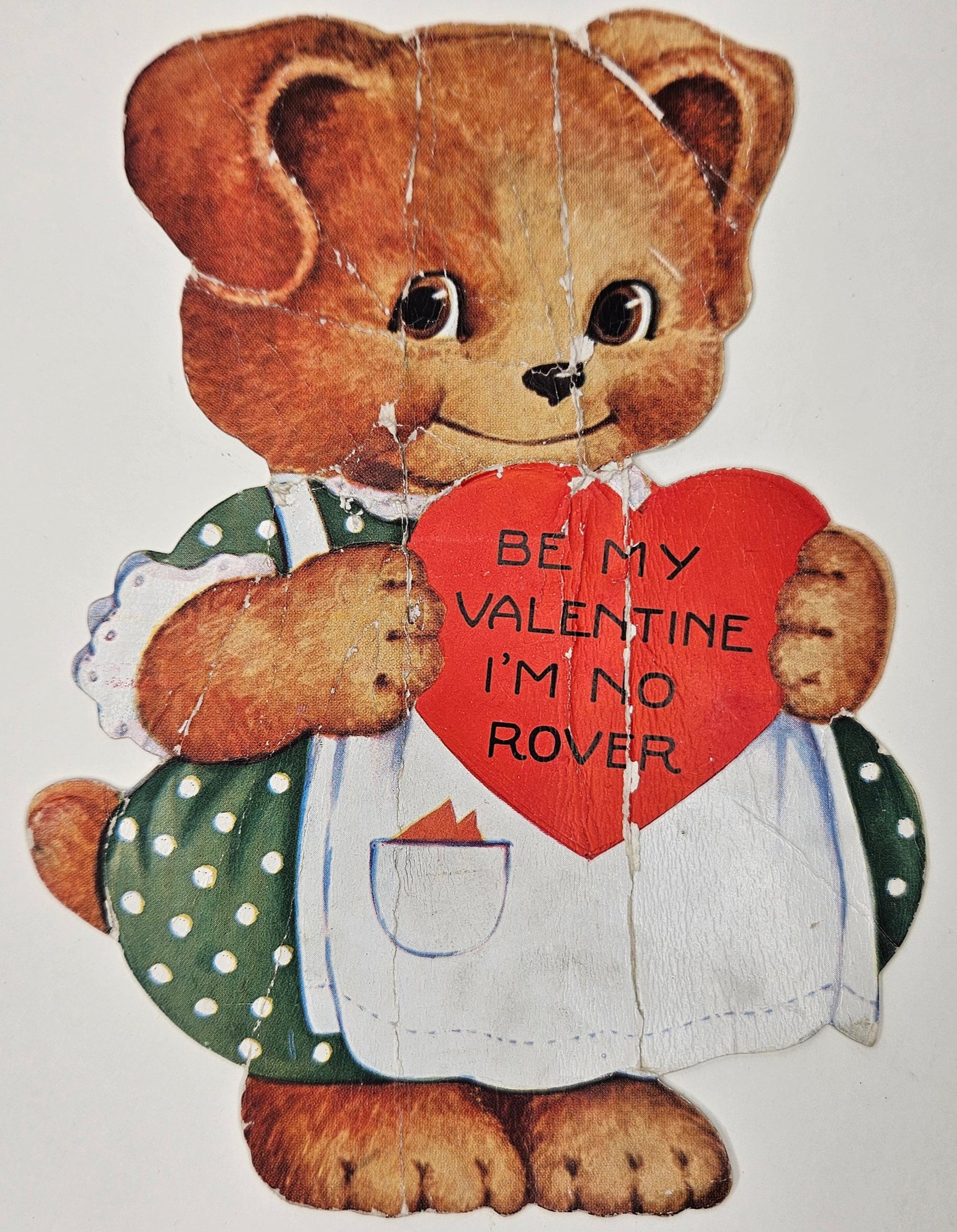 This little Valentine was well loved and kept for a very long time. The card depicts a female Puppy or little dog, who promises to not be a Rover, which is a male dog's actions. So was it given to her by a male?