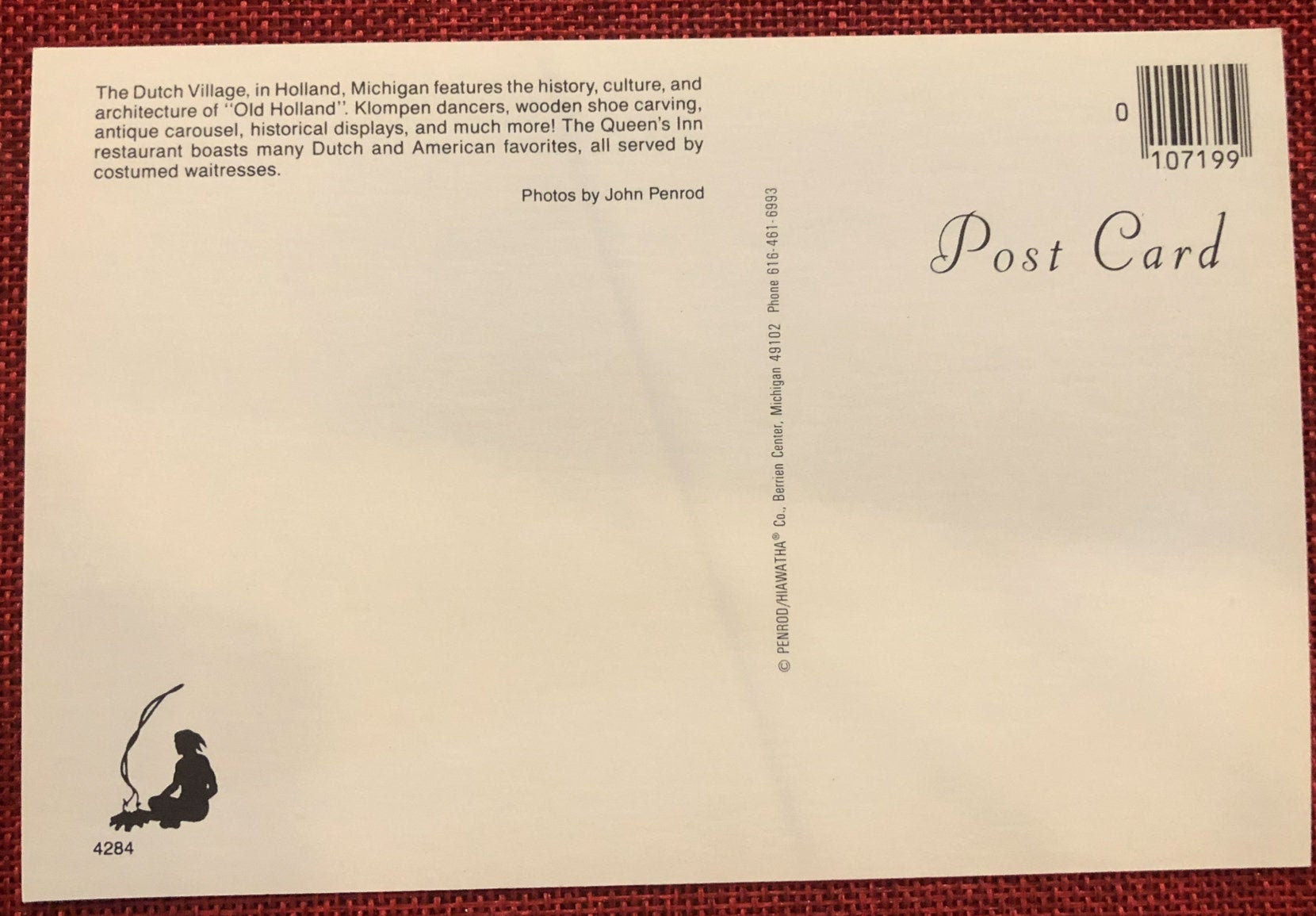 This vintage postcard is from the Dutch Village in Holland, Michigan where the Queen's Inn Restaurant is. With delicious Dutch and American food, it is a popular site. It was published by Penrod/Hiawatha with a photo by John Penrod. It was never sent and is in great condition.
