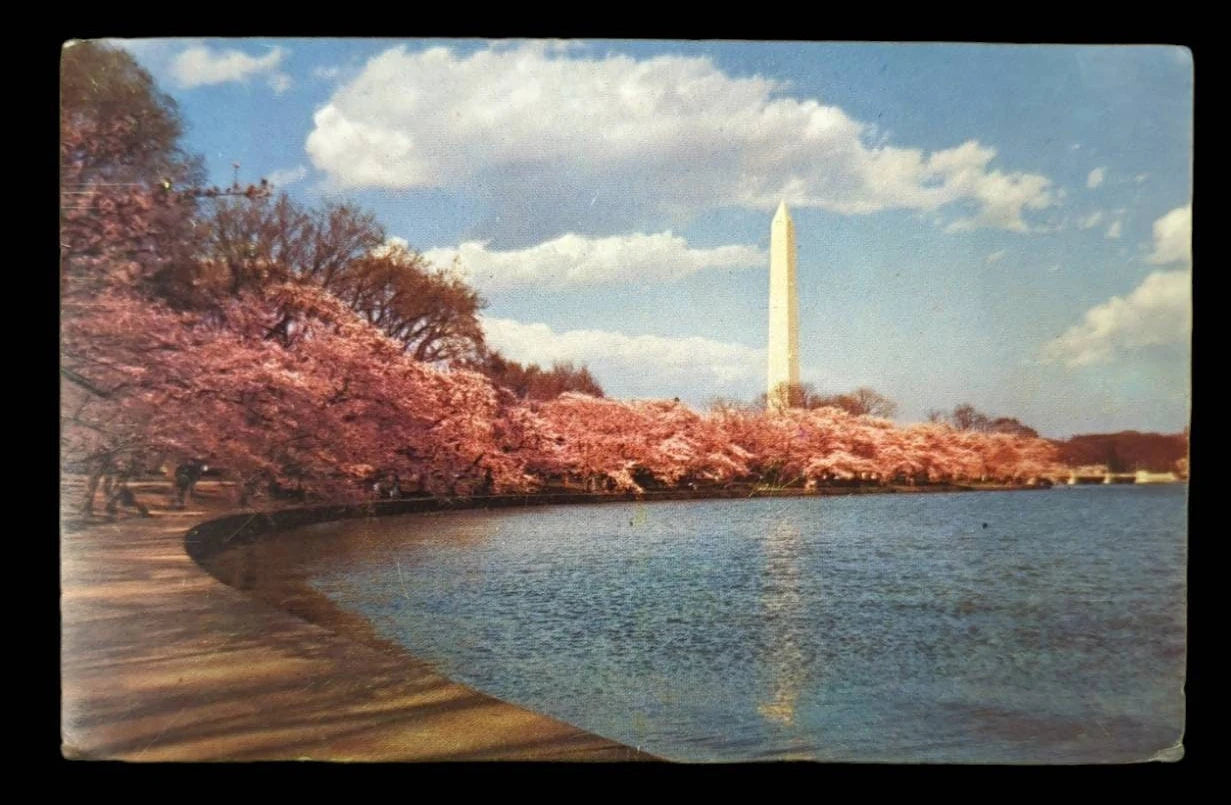 Back: The white marble shaft rises 555 feet and may be reached by elevator in 70 seconds. The cherry trees ordinarily bloom early in April.