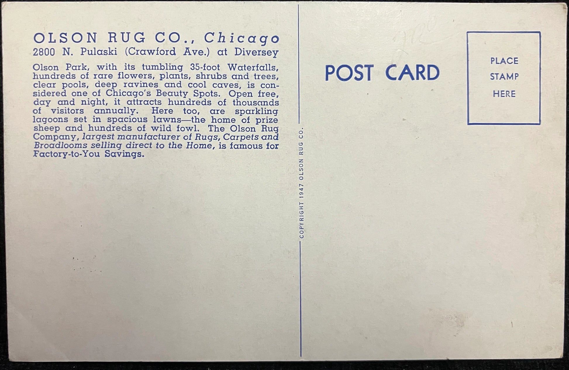 Back: OLSON RUG CO., Chicago 2800 N. Pulaski (Crawford Ave.) at Diversey Olson Park, with its tumbling 35-foot Waterfalls, hundreds of rare flowers, lants, shrugs, and trees, clear pools, deep ravines and cool caves, is considered one of Chicago's Beauty Spots. Open free day and night, it attracts hundreds of thousands of visitors annually. Here too, are sparkling lagoons set in spacious lawns - the home of prize sheep and hundreds of wild flow. The Olson Rug Company, largest manufacturer of Rugs, Carpets and Broadlooms selling direct to the Home, is famous for Factory-to-You Savings.