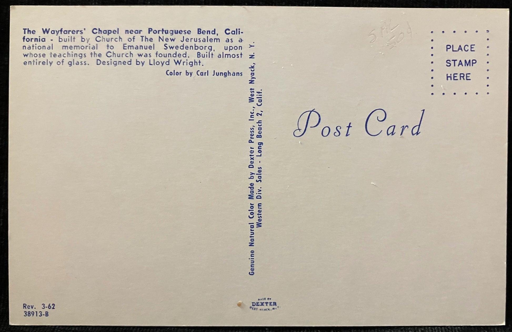 Back: Wayfarers’ Chapel near Portuguese Bend, California - built by Church of the New Jerusalem as a national memorial to Emanuel Swedenborg, upon whose teachings the Church was founded. Built almost entirely of glass. Desinged by Lloyd Wright.