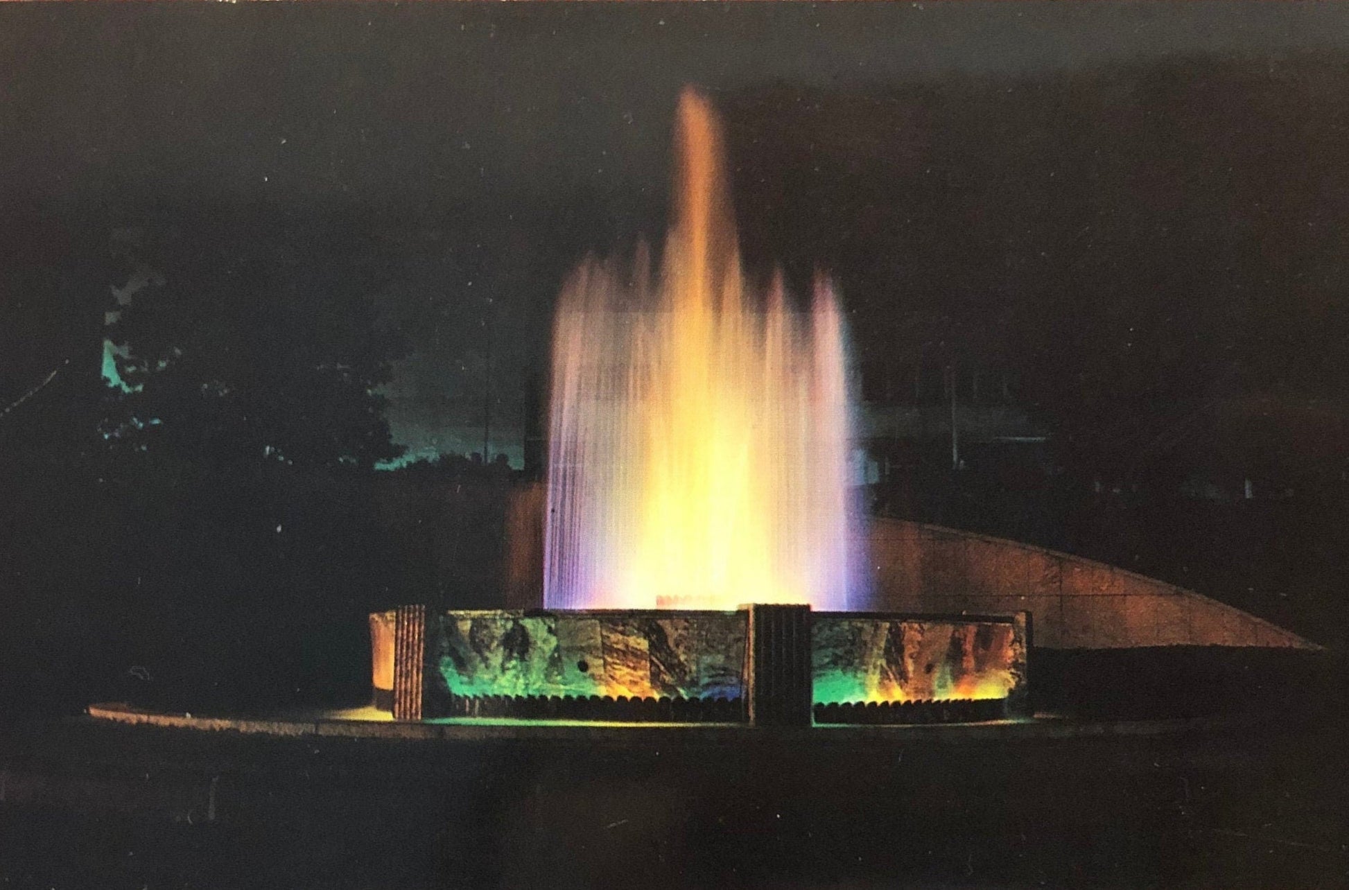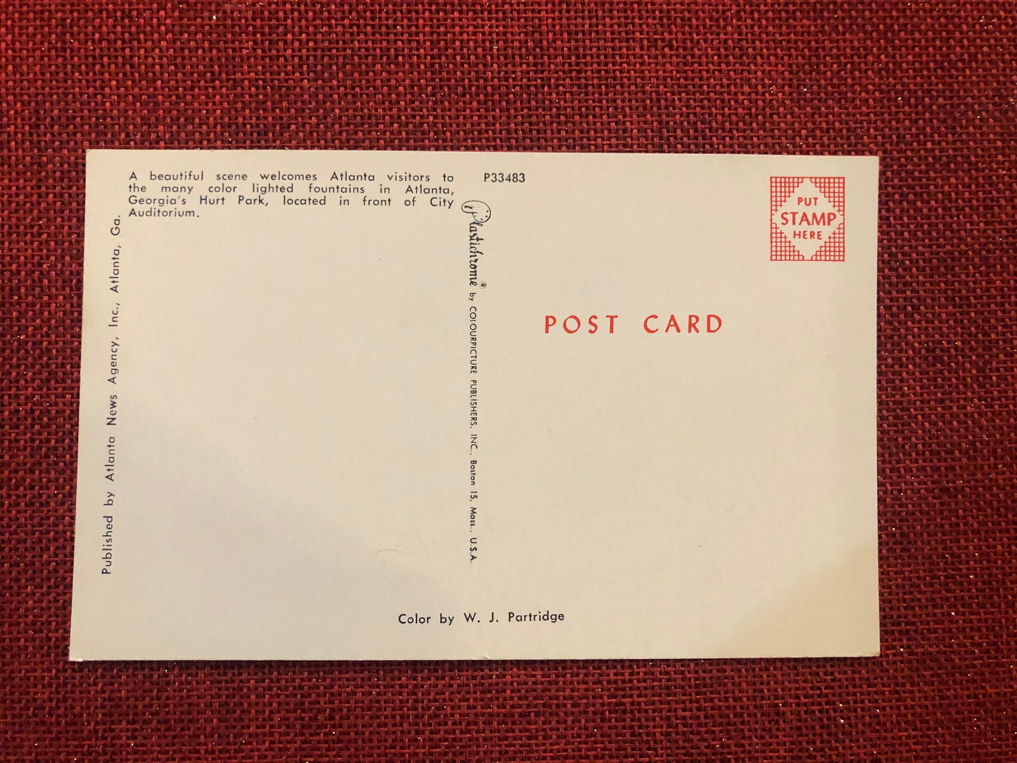 This classic postcard sends greetings to visitors to Atlanta, Georgia with a scene of its Hurt Park, located in front of the City Auditorium. It was produced by ColourPictures publishers and distributed by Atlanta News Agency. The photo is credited to W. J. Patridge.