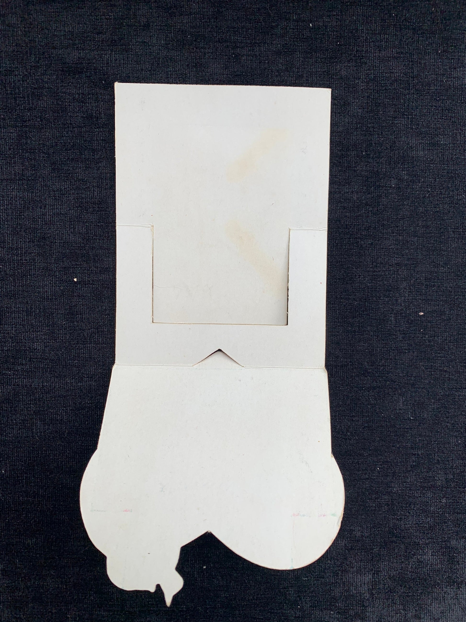This cute card can fold a variety of ways to focus on the different aspects of the Valentine. When the card is folded all that is visible is the cute colorful couple sitting under the word, “where.” The boy is pointing up at the word. The card can then be unfolded to reveal the rest of the message, “Where have you been all my life?” that is surrounded by multi colored hearts. The card can be unfolded all the way to reveal the whole scene as pictured. The card is in excellent condition and made from a heavy paper. It has no mark for origin.