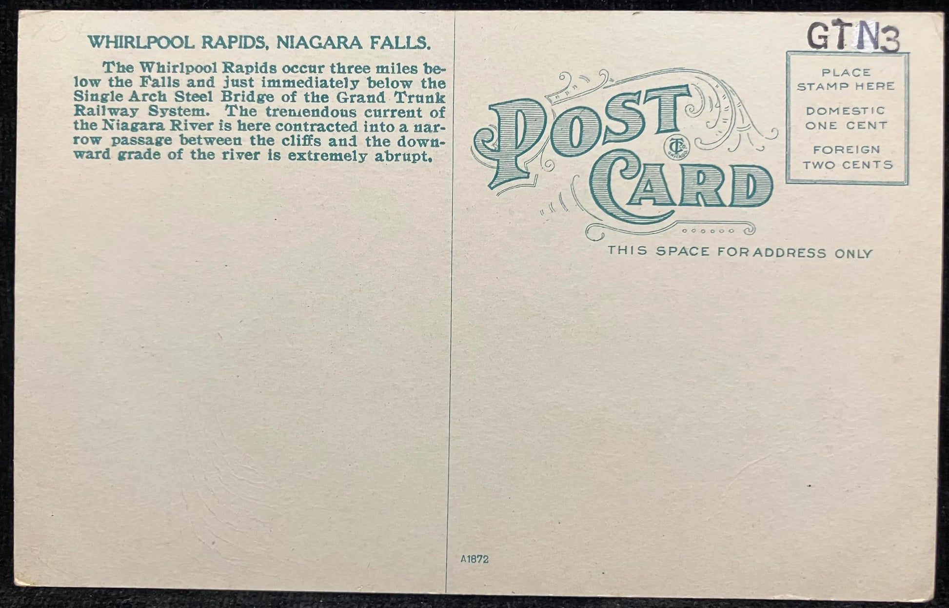 Back: WHIRLPOOL, RAPIDS, NIAGARA FALLS. The Whirpool Rapids occur three miles below the Falls and just immediately below the Single Arch Steel Bridge of the Grand Trunk Railway System. The tremendous current of the Niagara River is here contracted into a narrow passage between the cliffs and the downward grade of the river is extremely abrupt.