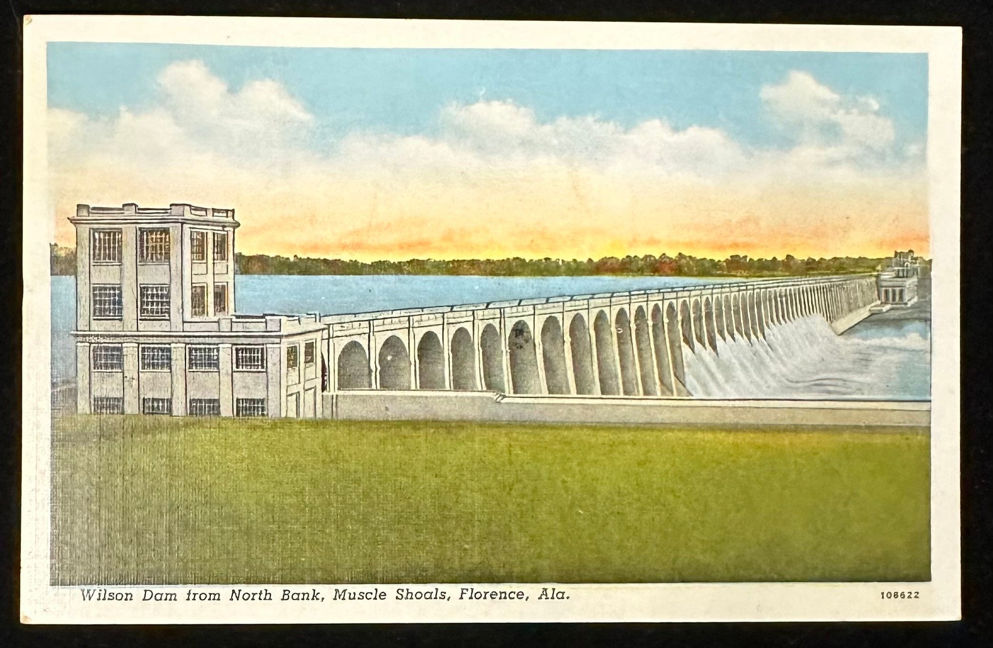 Wilson Dam from North Bank - Muscle Shoals - Florence, Alabama - Linen Vintage Postcard