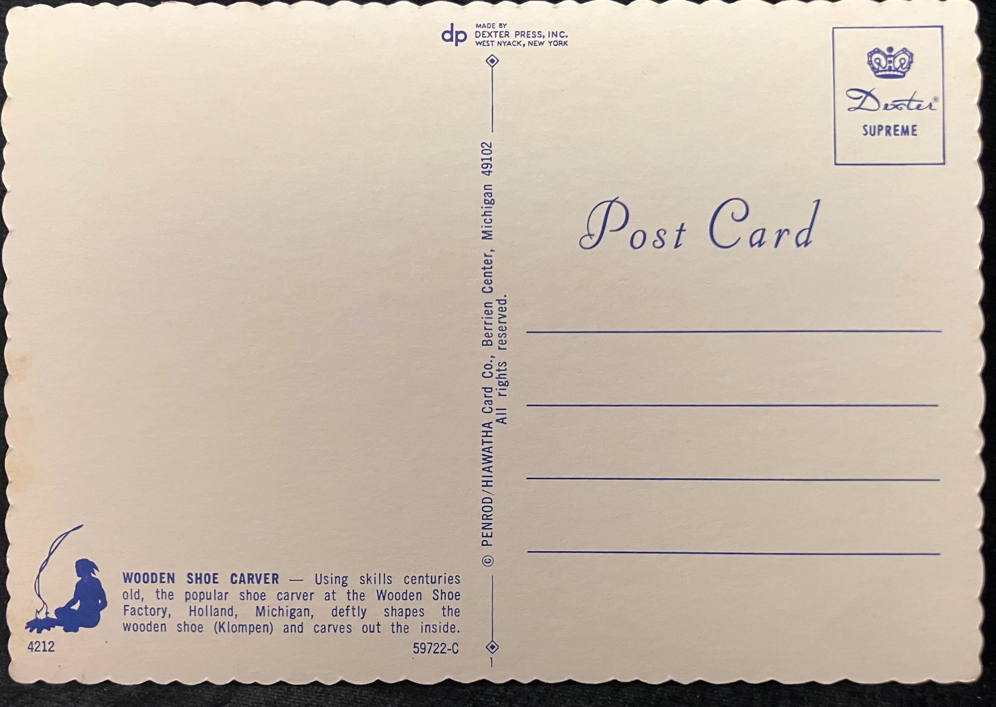 On back: Wooden Shoe Carver - Using skills centuries old, the popular show carver at the Wooden Shoe Factory, Holland, Michigan deftly shapes the wooden shoe (Klompen) and carves out the inside.