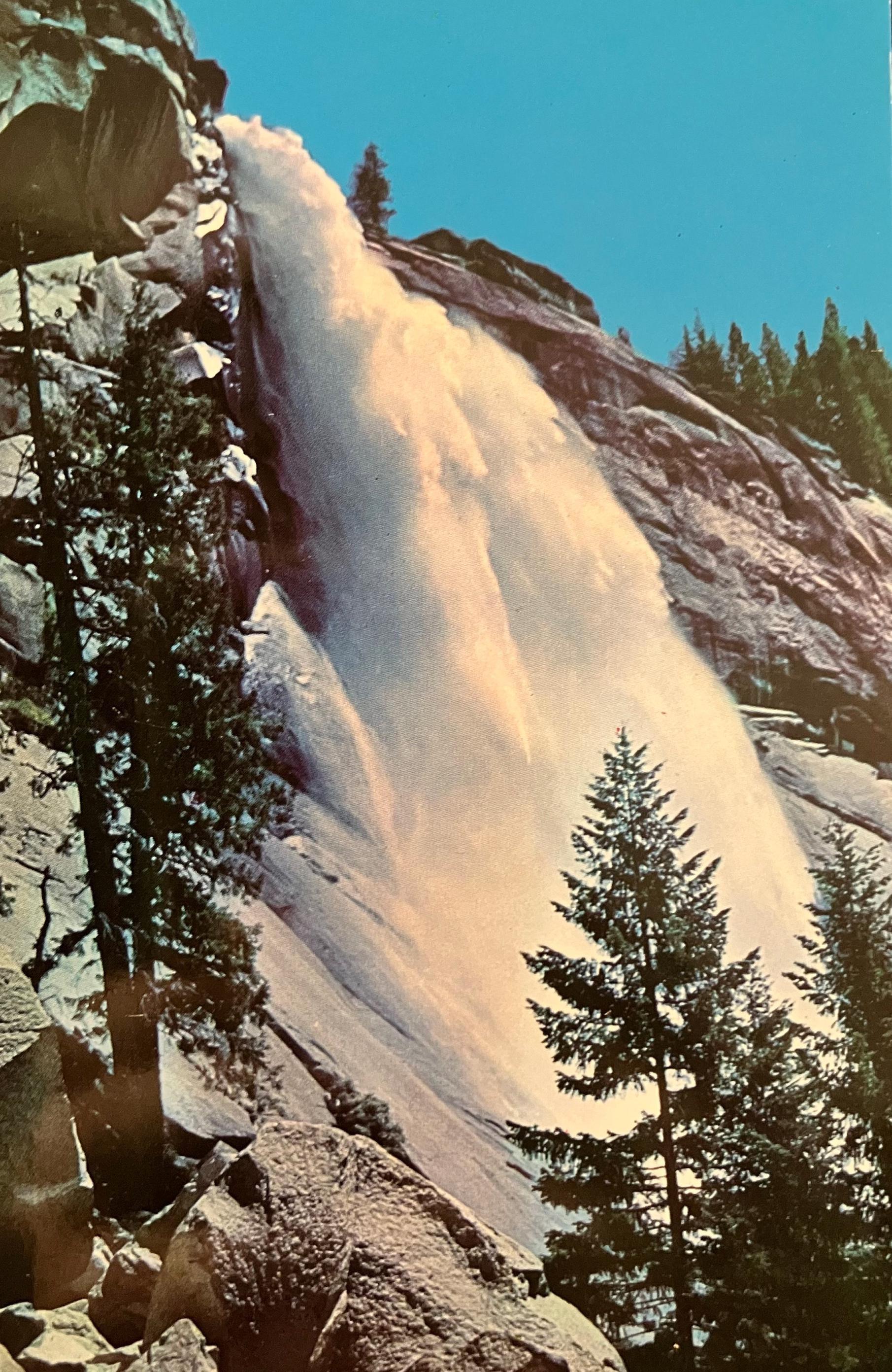Back: YOSEMITE NATIONAL PARK, CALIFORNIA NEVADA FALL The Merced River rushes through a canyon to the floor of the Valley in a series of two great waterfalls and about three and one-half miles of roaring, white crested cataracts. The first plunge of the river drops 594 feet over a sheer cliff to form one of the most spectacular fall sin Yosemite, - Nevada Fall.